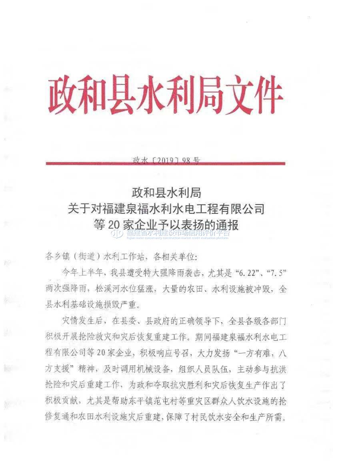 政和县水利局2019年企业抢险救灾的通报