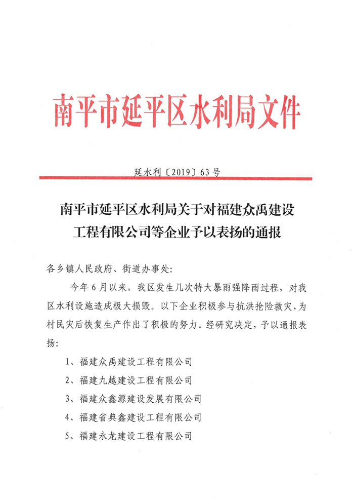 延平区水利局2019年企业抢险救灾的通报